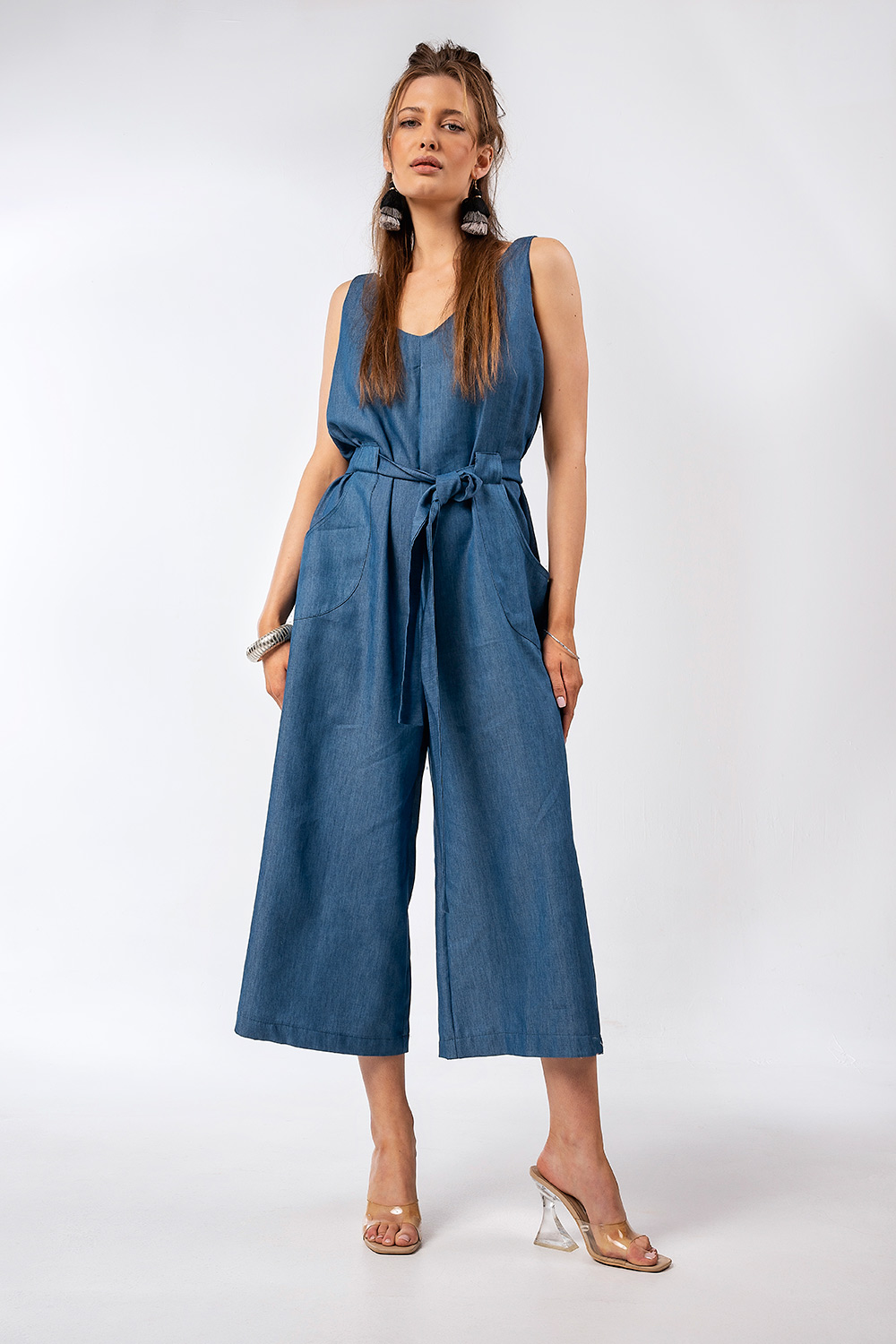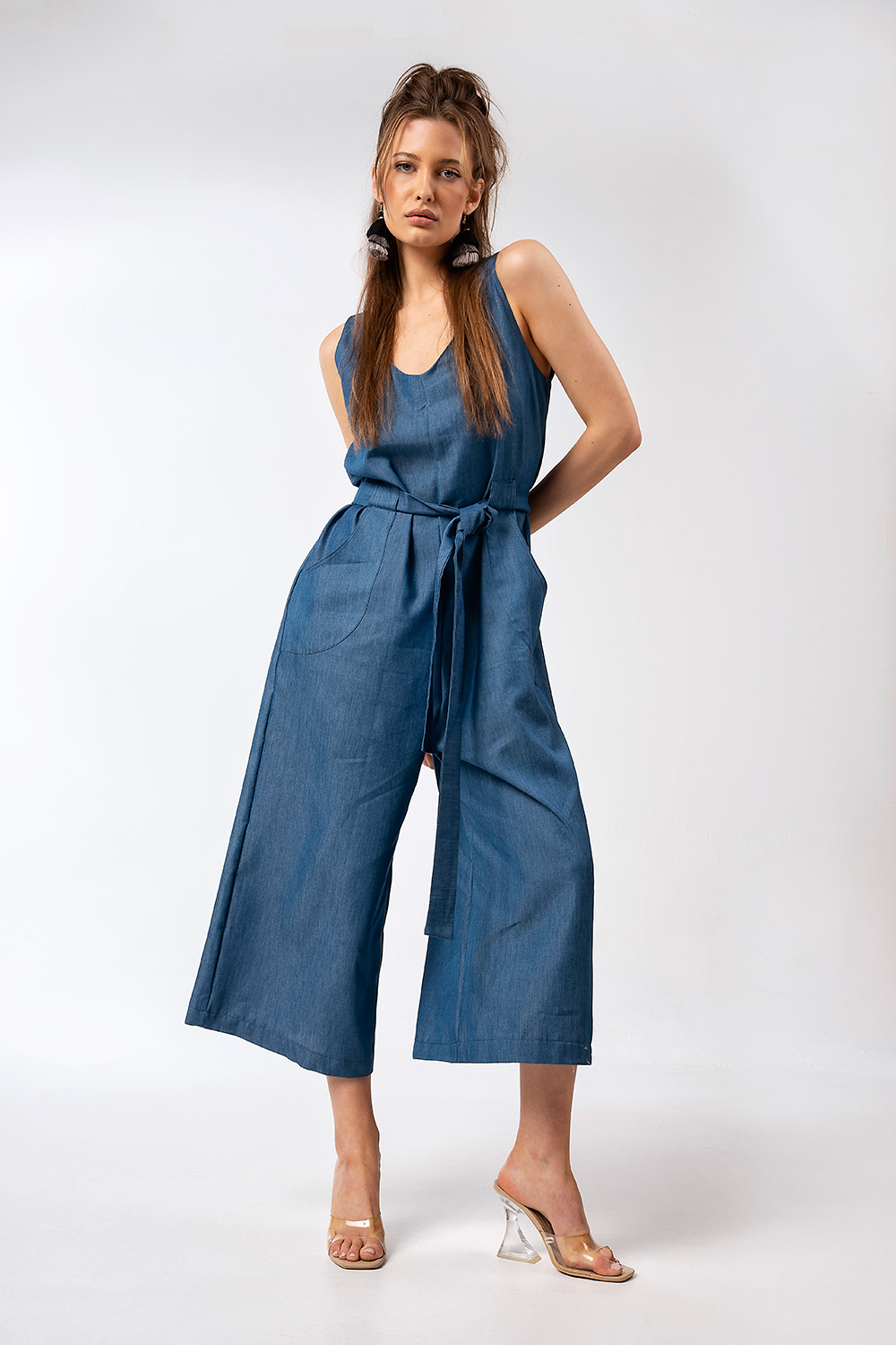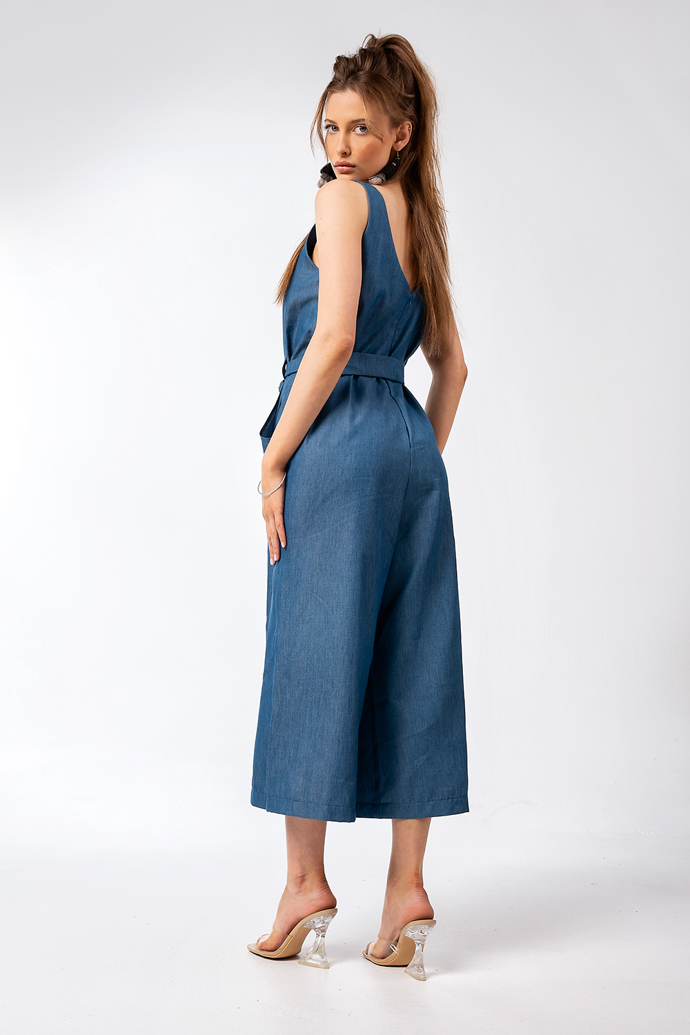 Ανακαλύψτε τη νέα μας καλοκαιρινή ολόσωμη φόρμα σε denim look απόχρωση, ιδανική για στιλάτες και άνετες εμφανίσεις.