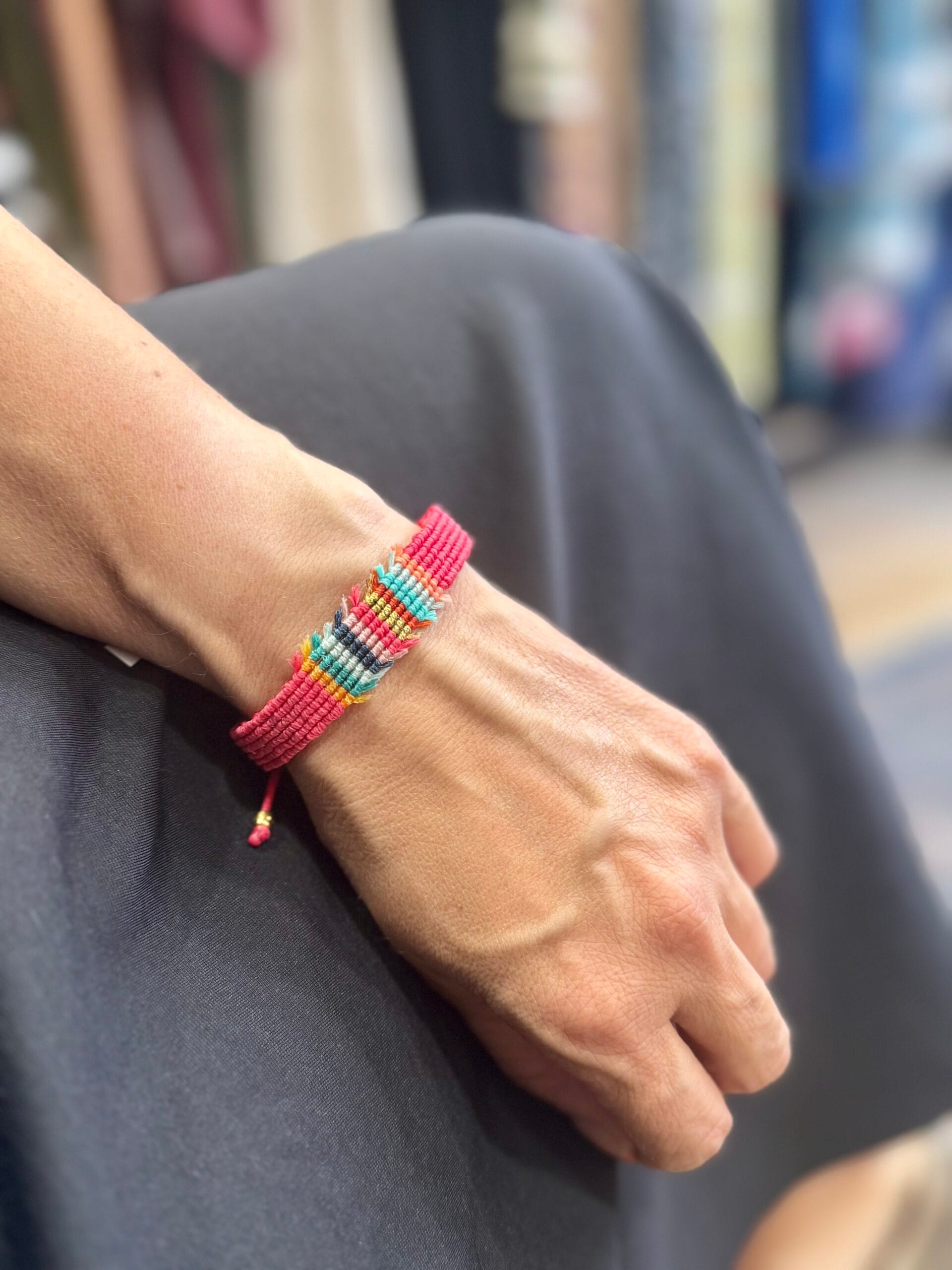Elevate your summer style with this unique handmade macrame bracelet in a chic fuchsia pink shade, adorned with multi color wax cord. Inspired by ethnic and boho lines, this piece exudes freedom, natural elegance, and effortless charm.