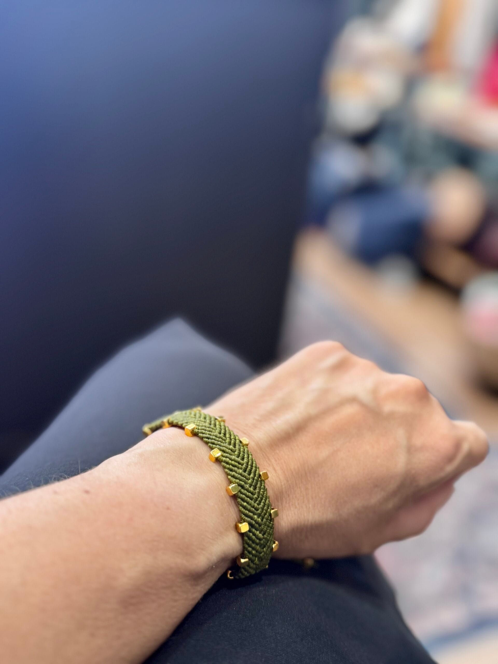 Elevate your summer style with this unique handmade macrame bracelet in a chic olive green shade, adorned with gold-plated squares. Inspired by ethnic and boho lines, this piece exudes freedom, natural elegance, and effortless charm.