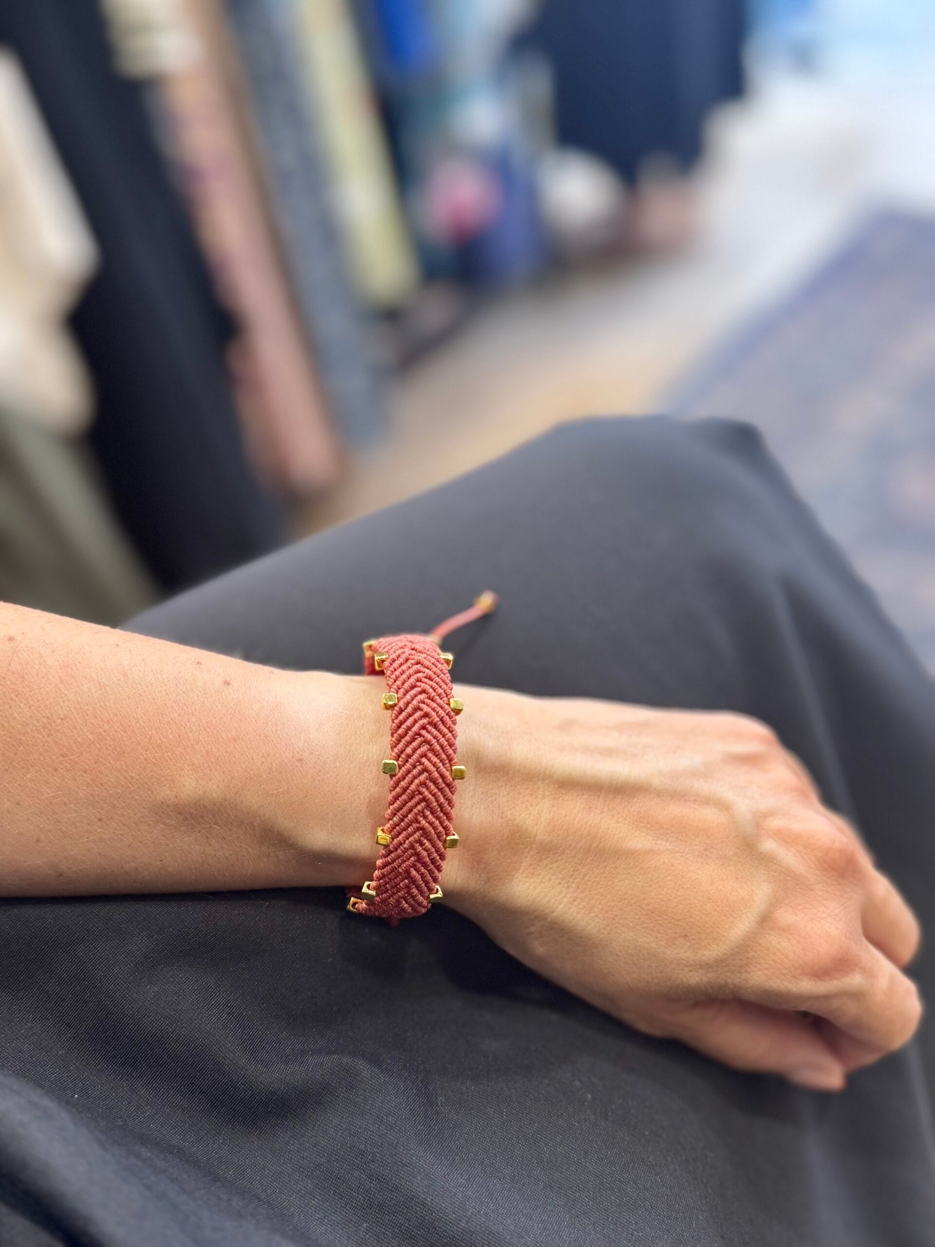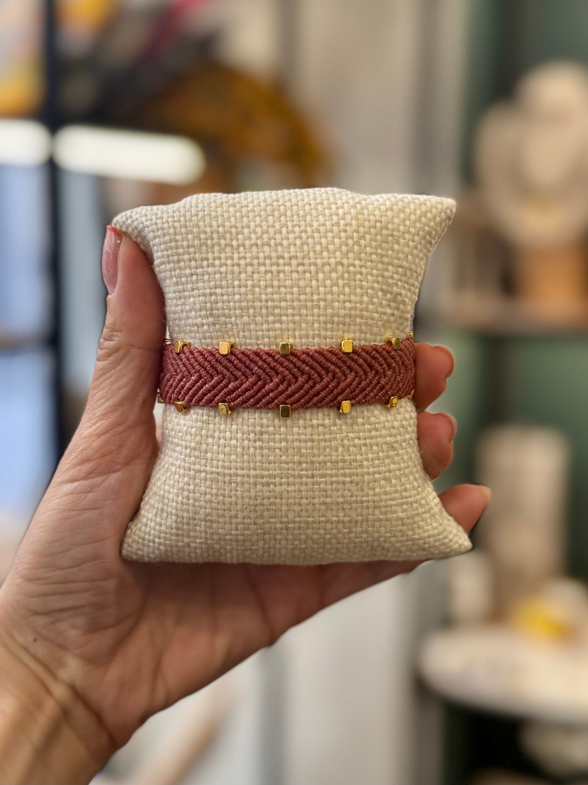 Elevate your summer style with this unique handmade macrame bracelet in a chic terracotta color, adorned with gold-plated squares. Inspired by ethnic and boho lines, this piece exudes freedom, natural elegance, and effortless charm.