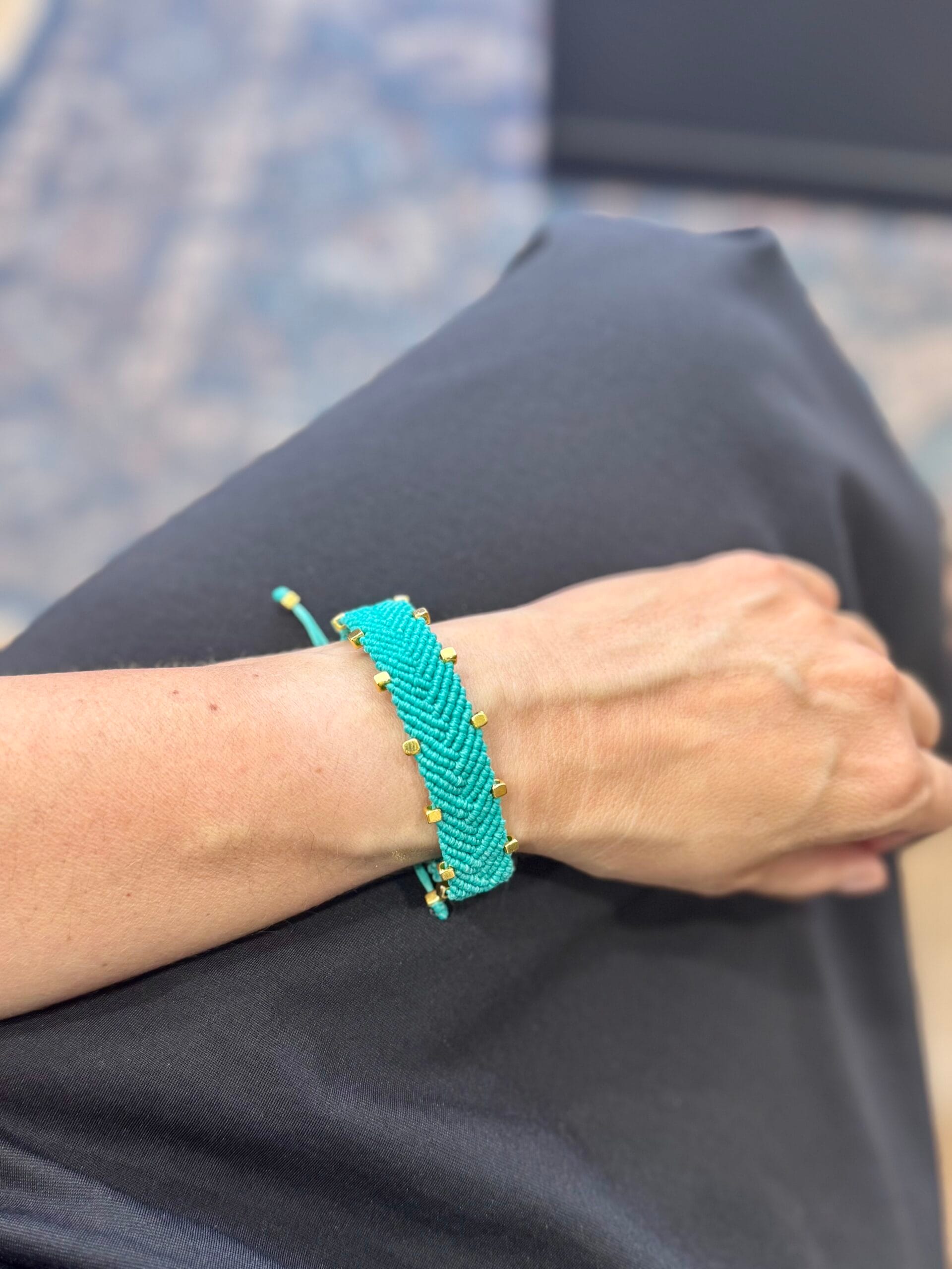 Elevate your summer style with this unique handmade macrame bracelet in a chic turquoise shade, adorned with gold-plated squares. Inspired by ethnic and boho lines, this piece exudes freedom, natural elegance, and effortless charm.