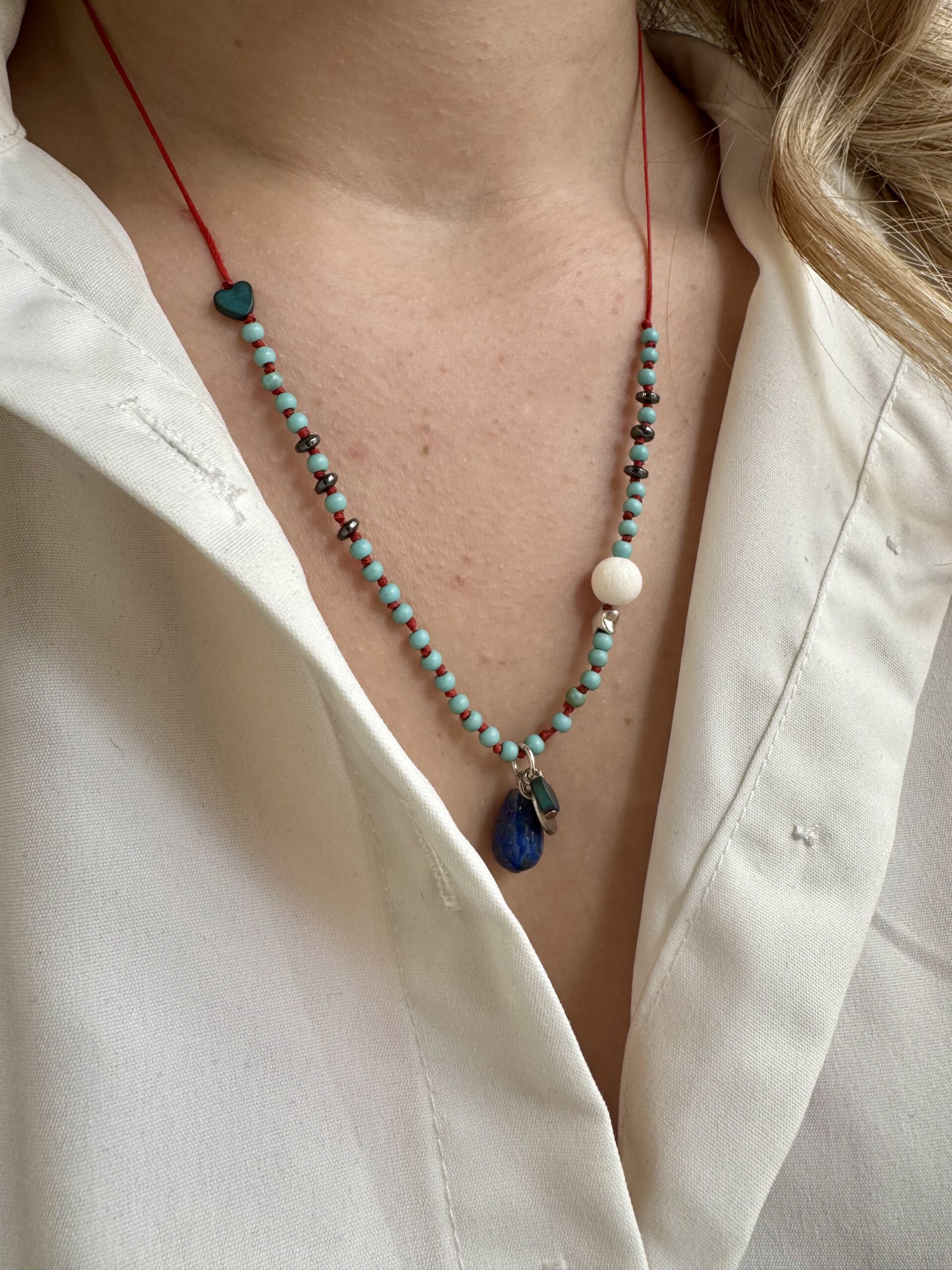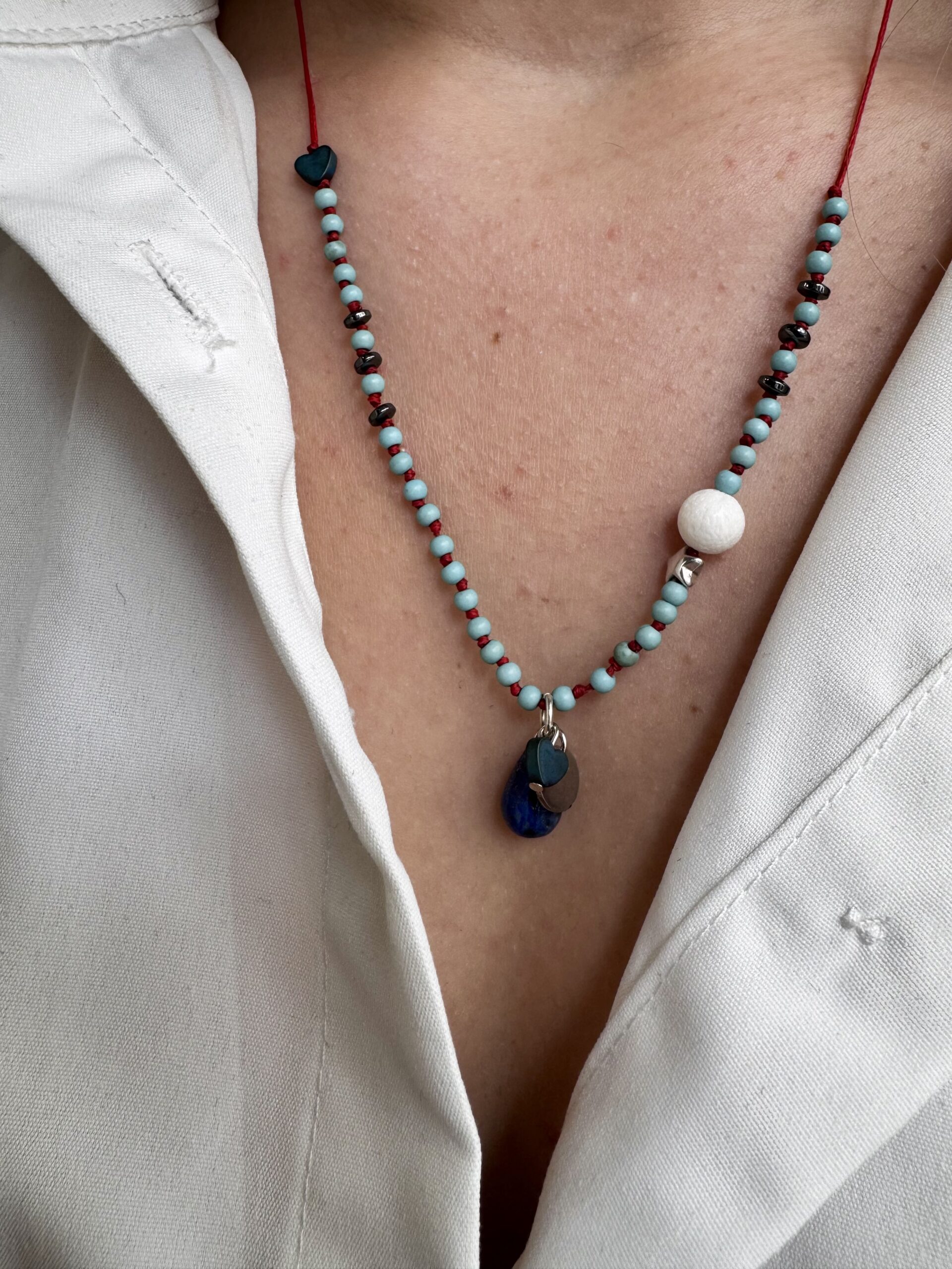 A distinctive necklace, hand knotted bead by bead, featuring semi precious stones such as hematite, pearl, howlite, and lapis lazuli.