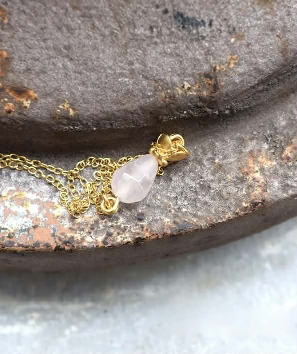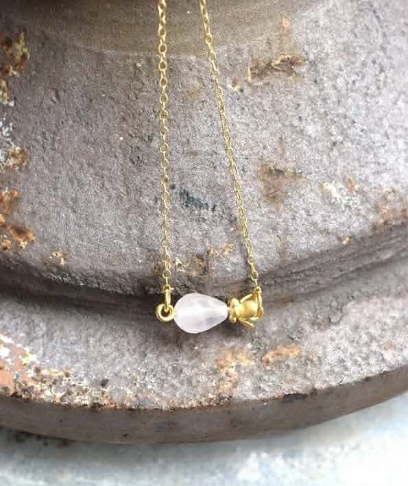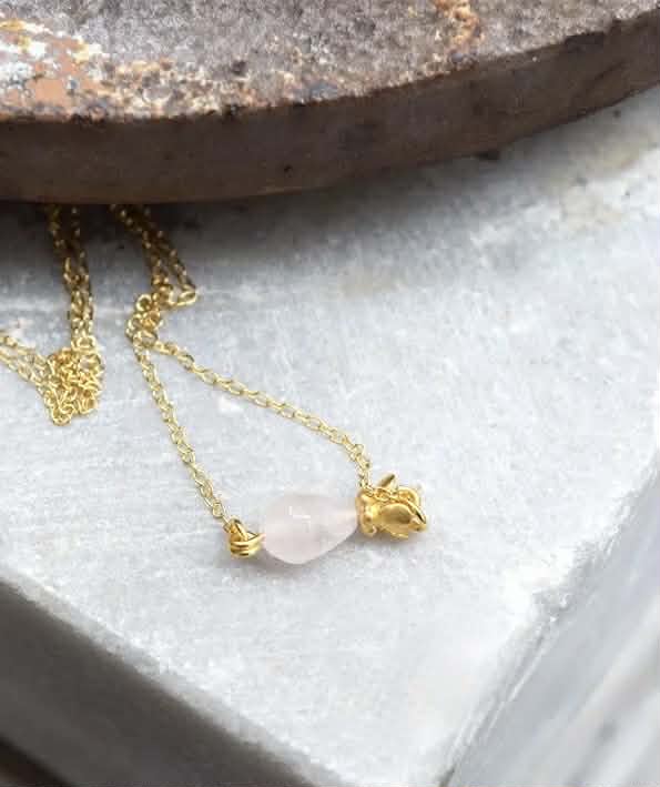 Το χειροποίητο κολιέ από ασήμι επιχρυσωμένο κοσμείται από ένα ροζ quartz.