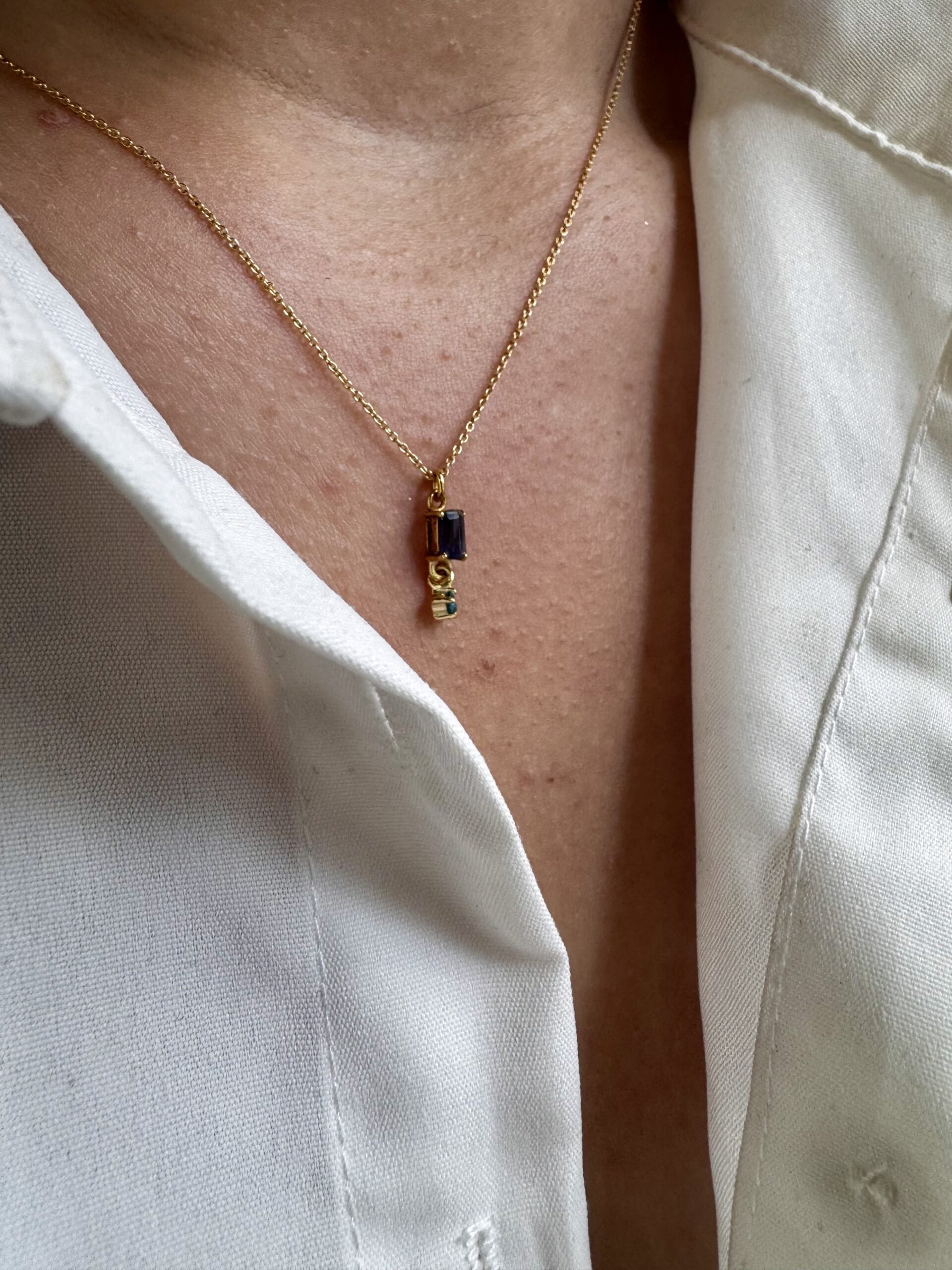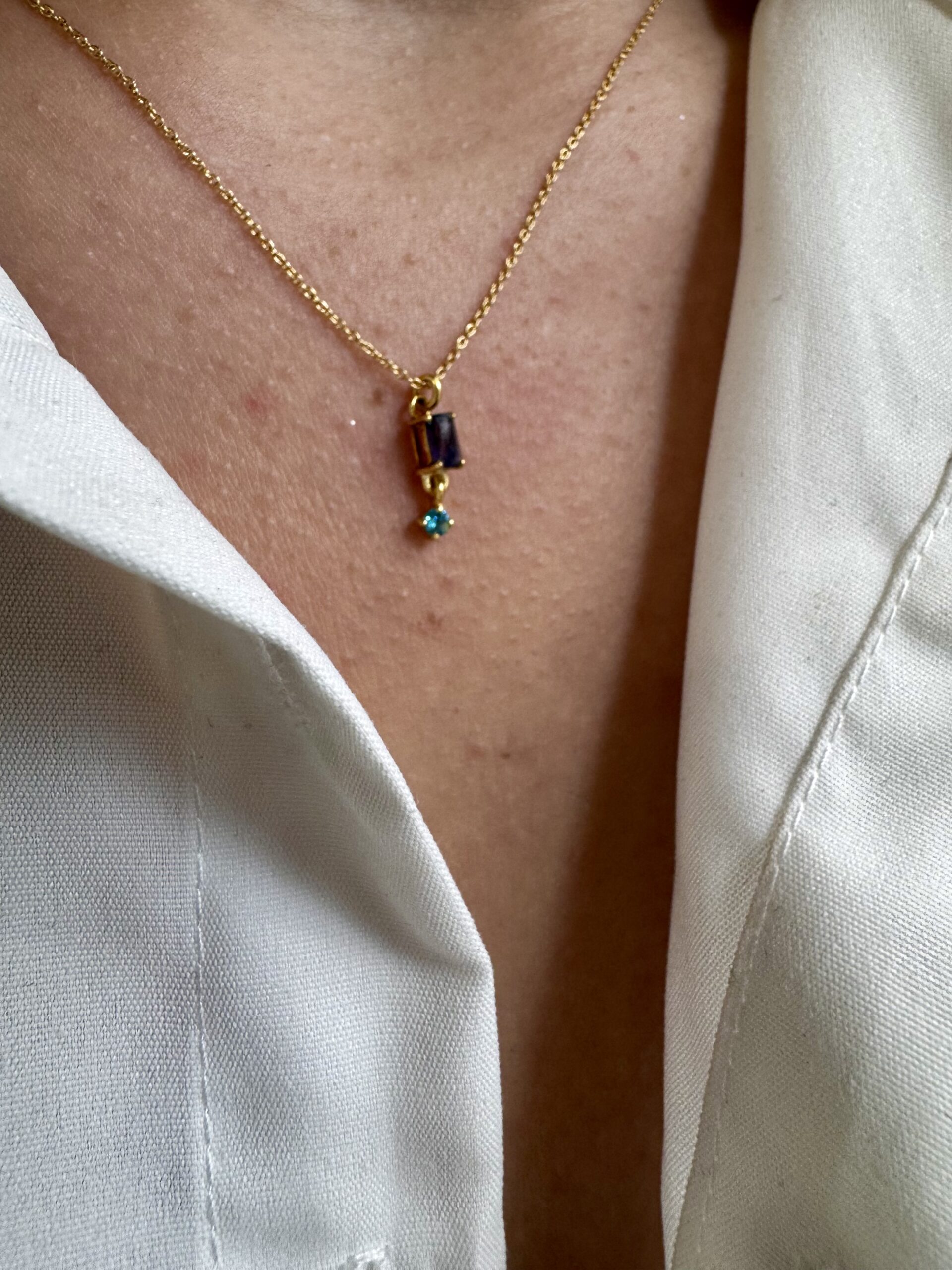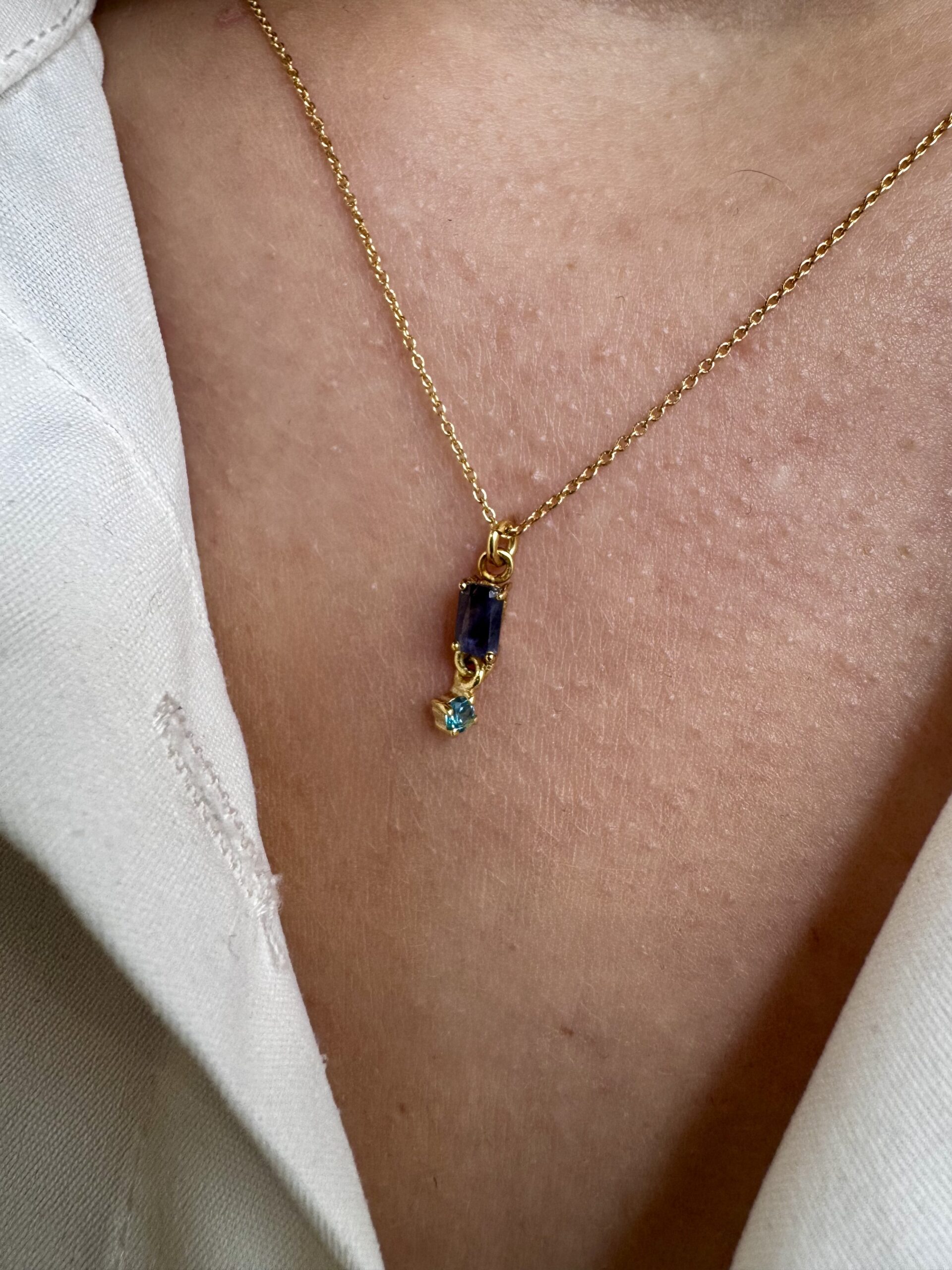 Χειροποίητο κολιέ από επιχρυσωμένο ασήμι 925 το οποίο κομείται με δύο ημιπολύτιμες πέτρες έναν μοβ χαολίτη και ένα μπλε τοπάζι.