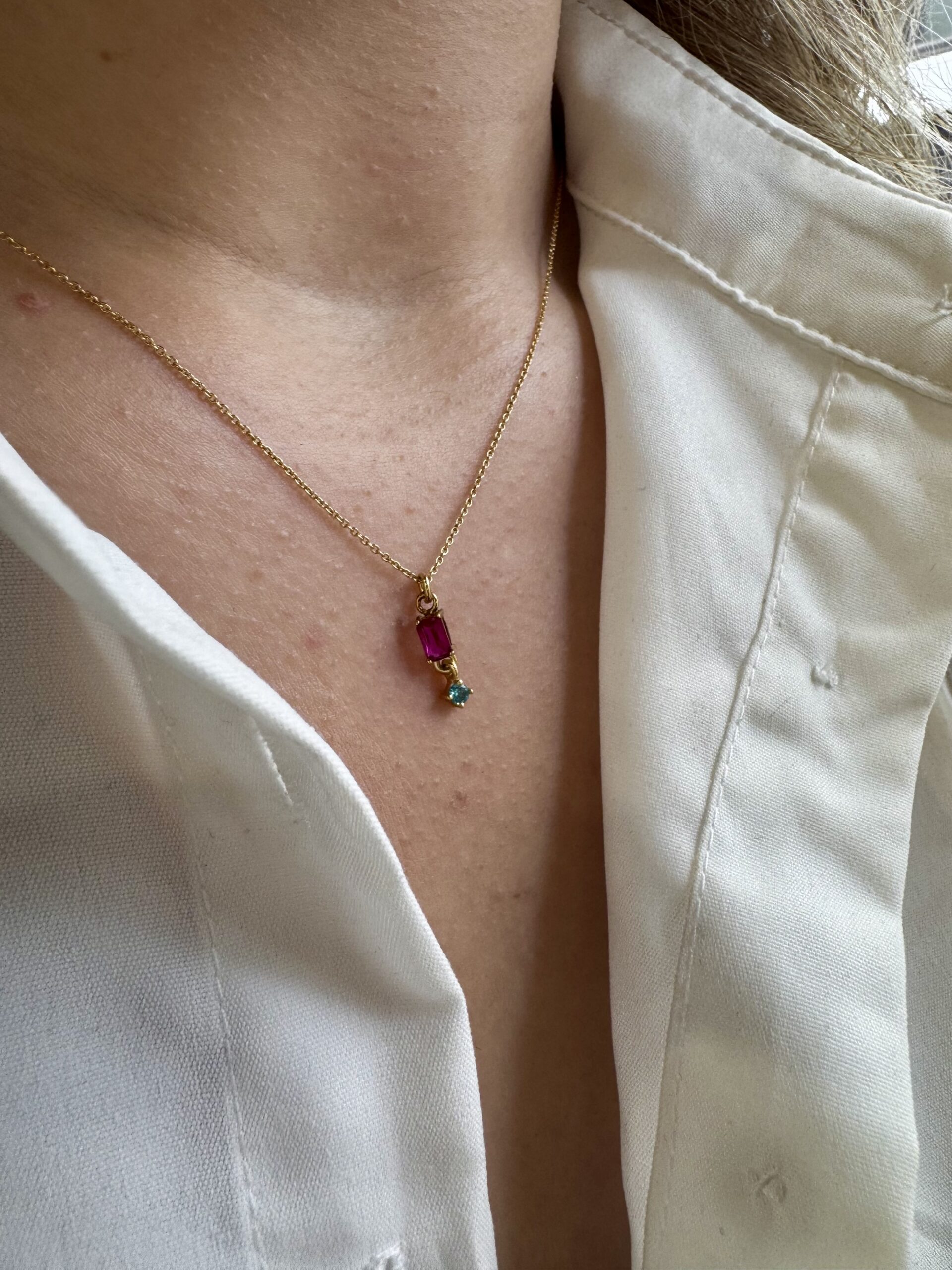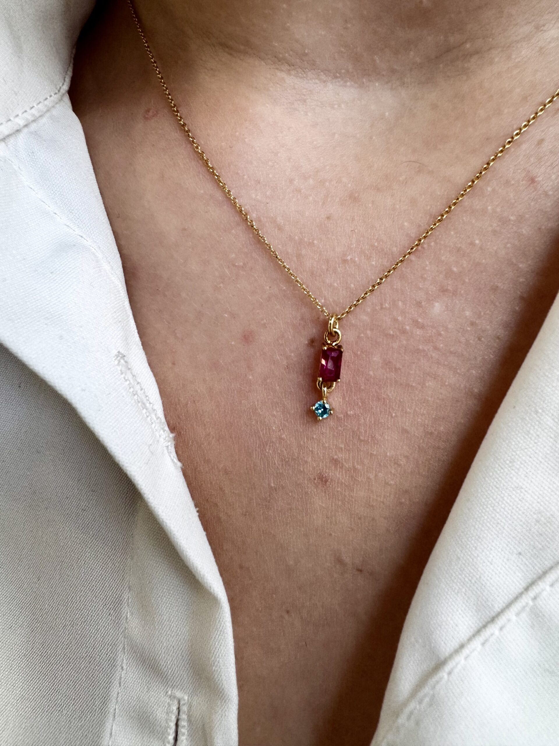 Χειροποίητο κολιέ από επιχρυσωμένο ασήμι 925 το οποίο κομείται με δύο ημιπολύτιμες πέτρες έναν φούξια χαολίτη και ένα μπλε τοπάζι.