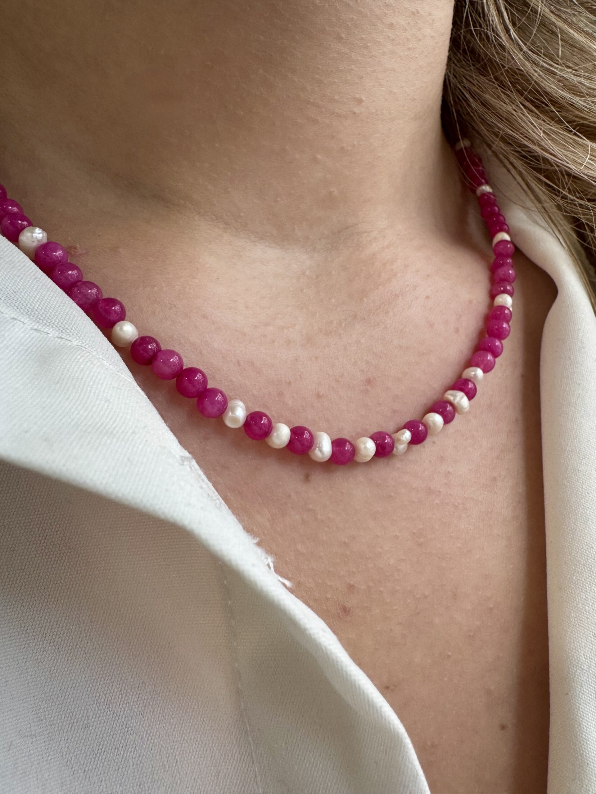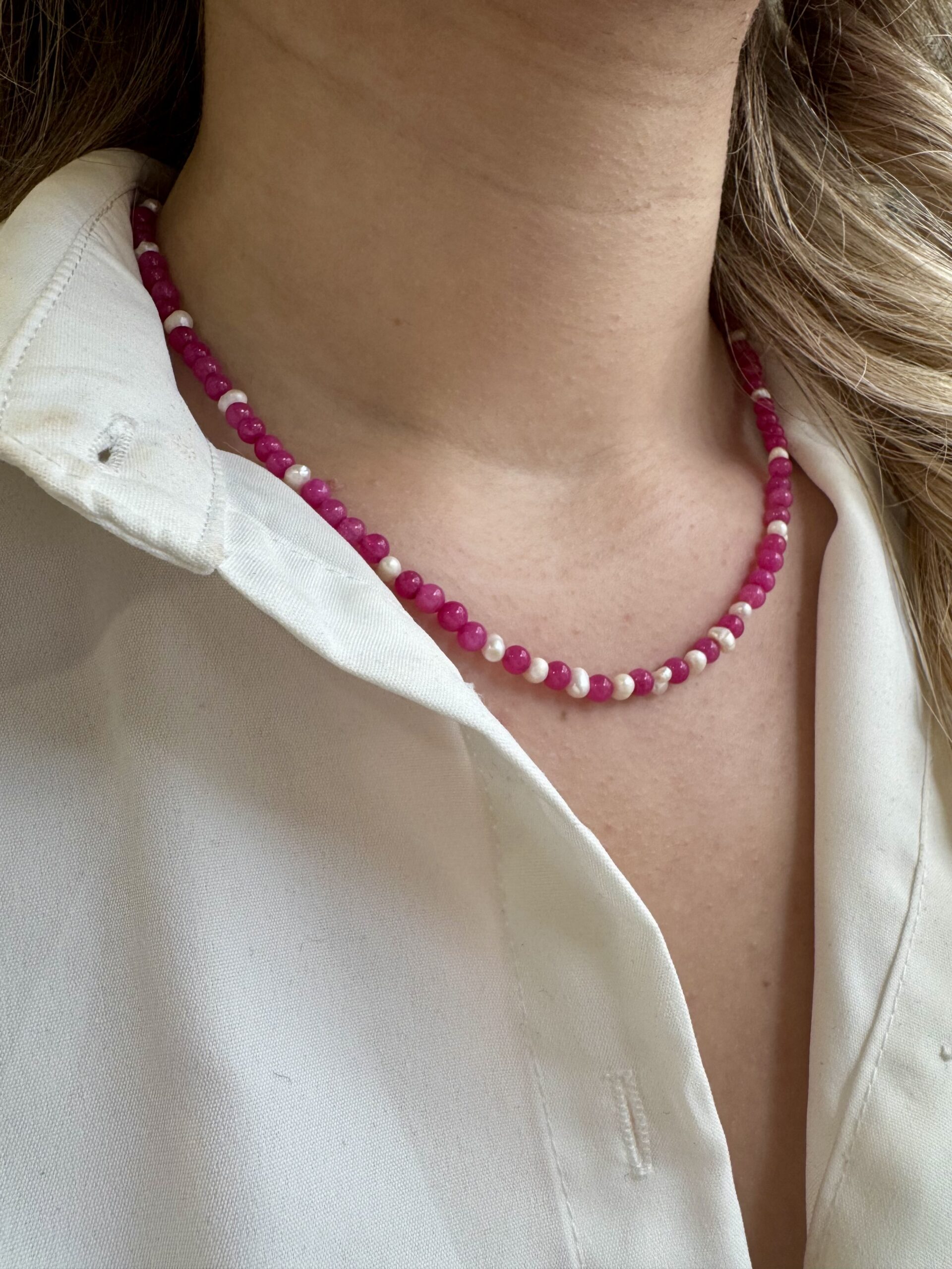 Κατασκευασμένο από μία σειρά πέτρες νεφρίτη και μαργαριτάρια, αυτό το κόσμημα αποτελεί μια μοναδική πρόταση για γυναίκες που αναζητούν την τέλεια ισορροπία ανάμεσα στην απλότητα και τη φινέτσα. Το λεπτό και φίνο σχέδιό του το καθιστά ιδανικό για όλες τις ώρες, προσφέροντας τη δυνατότητα να συνδυαστεί εύκολα τόσο με casual σύνολα όσο και με πιο επίσημες εμφανίσεις.