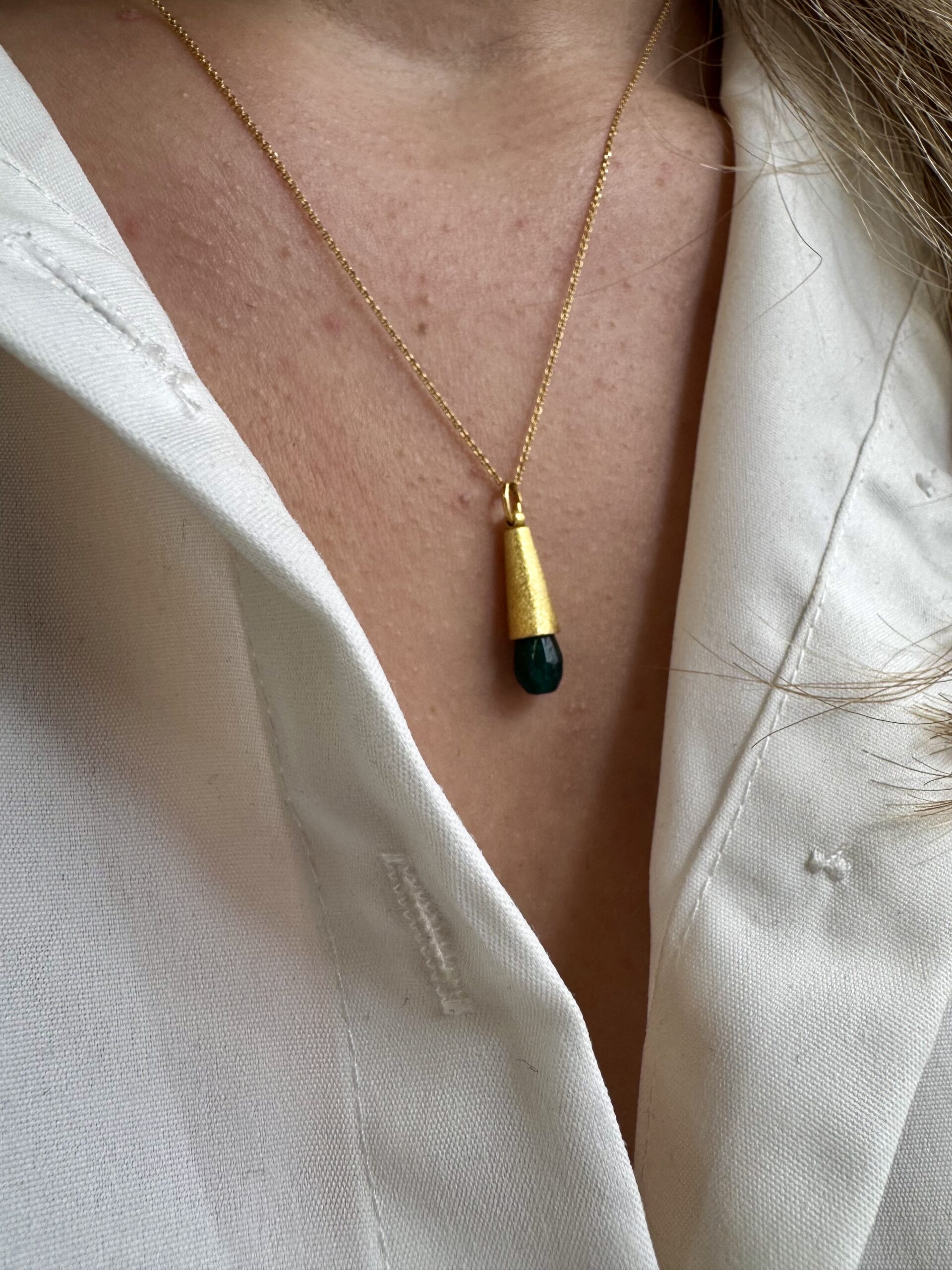 Ανακαλύψτε το μοναδικό κρεμαστό με charm ένα κώνο διακισμημένο μια ημιπολύτιμη πέτρα – Νεφρίτη, κατασκευασμένο από επιχρυσωμένο ασήμι 925.